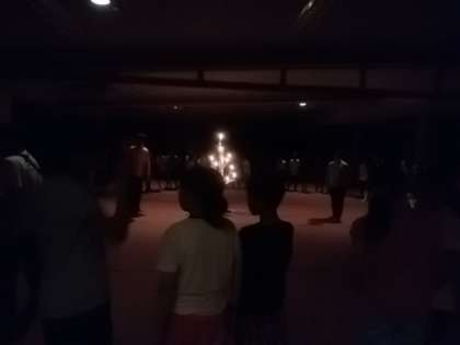 雨のため、キャンプファイアは中止。屋内でキャンドルファイヤーが始まりました。