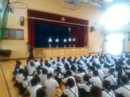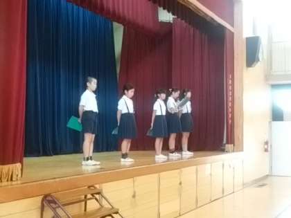7日朝、児童平和集会がおこなわれました。8月14日の京橋駅空襲慰霊祭に参加した児童がそのようすを発表してくれました。最後に平和を願って全校児童で「青い空は」を合唱しました。