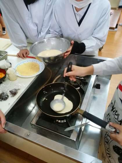 25日水曜日、5年生が調理実習をしました。今回はクレープを作りました。一人二枚焼くそうです。お好み焼きのように焦げ目のついたものもありました。
