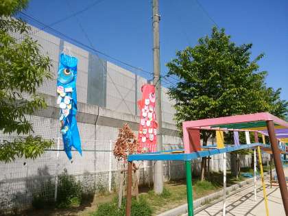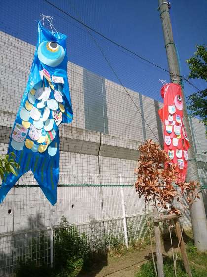 こどもの日ももうすぐです。聖賢小学校の鯉のぼりも運動場ではためいています。なかよし学級のみんなが作ってくれました。