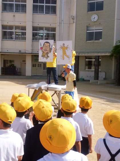 今朝、城東区役所安全パトロール隊の皆さんが来校し、パネルを使って活動内容を説明してくださいました。
