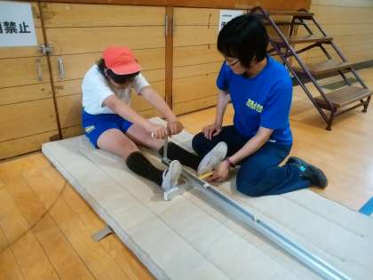 今日は講堂でスポーツテストをしました。雨のため、運動場でのソフトボール投げは延期しました。