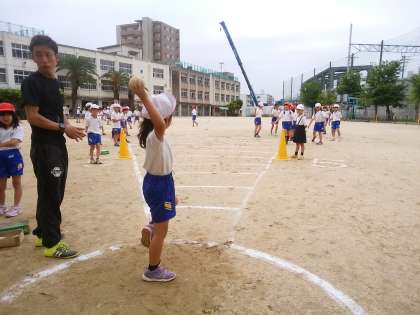 雨も上がり、昨日延期になっていたソフトボール投げをしました。2年生はまだまだ力感のないフォームです。指導が必要です。