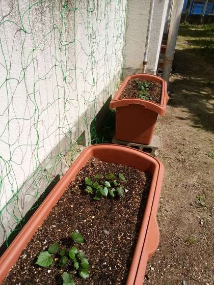 1年生と4年生の教室への強い日差しを和らげるために、琉球アサガオ植えました。