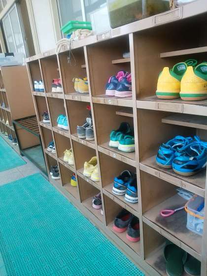 本校では昨年から、くつのかかとと下駄箱のへりを揃える「くつピタッ!」を指導しています。まだまだクラスによって差があります。