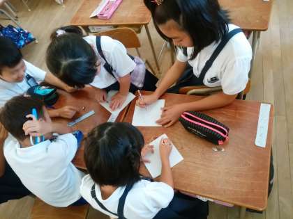別の部屋では5年生が1年生に折り鶴の折り方を教えていました。