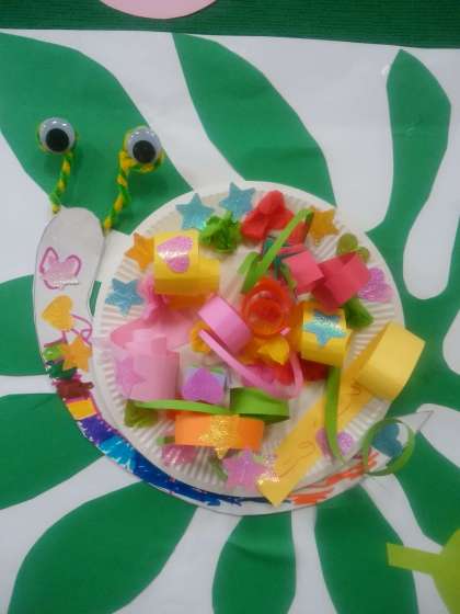これは手作りのマスカラです。中身はお米や小豆です。素敵な音がします。それからこんなお洒落なカタツムリを作りました。紙皿に色画用紙やいろはな紙でカラフルに飾り素敵なかたつむりができました。今なかよし学級の教室に掲示しています。