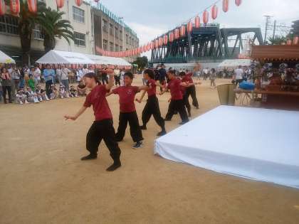 本校児童の出し物が続きます。聖賢鼓笛隊の演奏に続いて、聖賢夢舞人のよさこい演舞の披露です。