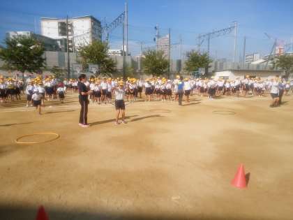 今週の児童集会は障害物リレーです。フラフープをなわとびのようにして回るのは、ちょっとむずかしいようでした。