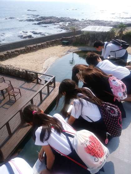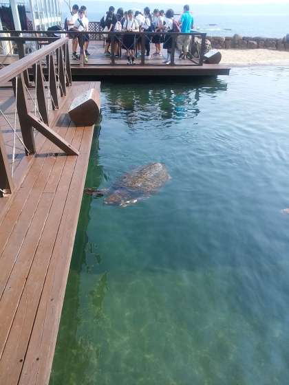 ウミガメに餌をやっています。海風が心地良いです。