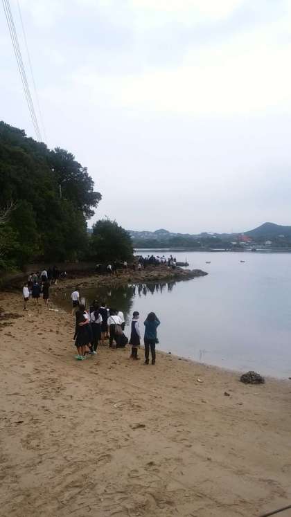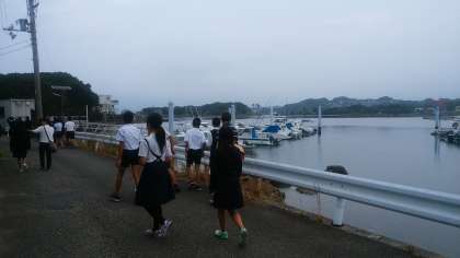 7時20分、宿舎近くの海辺を散策しています。天気は曇り空