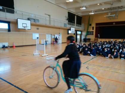 456年生の交通安全指導は正しい自転車の乗り方です。1学期に交通安全子供自転車大阪府大会に出場した6年生の皆さんが模範を示してくれました。