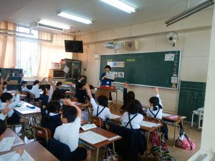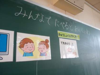今年も他校の栄養教諭を招いて「栄養指導」の授業をします。早速、本日、成育小の先生が1年生に給食について教えてくださいました。
