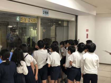 長い連休明けの月曜日、早速4年生が鶴見ゴミ焼却工場へ見学に行きました。ホールでレクチャーを受けた後、グループに分かれて工場内の見学です。写真はゴミを掴み上げるクレーンが稼働している様子を覗いているところです。