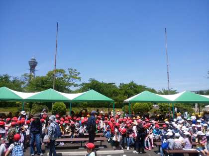 1・2年生が天王寺動物園へえんそくに行きました。お弁当会場はいろんな学校でごった返しています。右奥の黄色い帽子が聖賢小学校です。