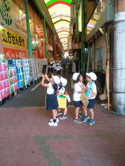 2年生がまちたんけんに行きました。場所は城東商店街です。グループに一台タブレットを持って、気になるお店を撮影しました。来週はお店の人にインタビューする予定だそうです。