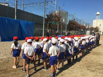 本日、創立100周年記念品クライミングウォールの除幕式がありました。寄贈者代表として竹内周年事業委員長と杉田 PTA 会長をご来校いただき、1年生の代表と幕ならぬブルーシートをめくり取りました。その後早速一年生がホールにしがみついて遊んでいます。