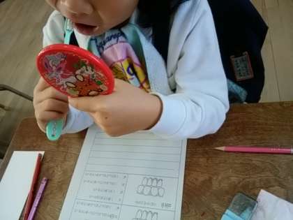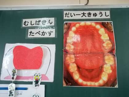 今日は2年生が大阪市から派遣された歯科衛生士の歯磨き指導を受けました。指導には学校歯科医の辻本先生にもご協力いただきました。