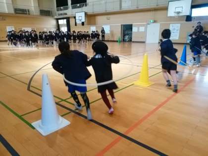 本日、蒲生幼稚園の訪問を受けました。1年生がホストホステス役を務めてくれました。体育館では寒さに負けず元気いっぱいゲームを楽しみました。