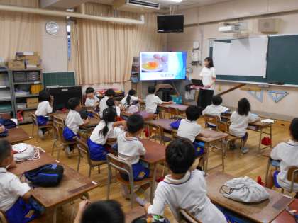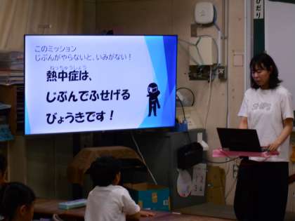 まだまだ暑い日が続きますが、今日は、本校の養護教諭が1年生について、映像を交えながら、熱中症の危険性や対策について説明していました。