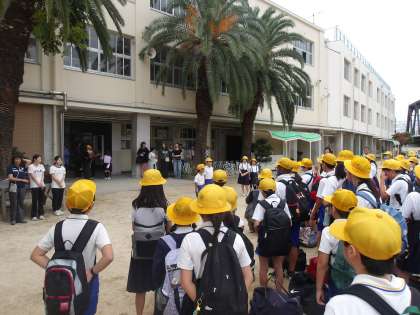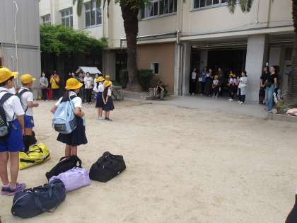 台風の影響で天候が心配されていましたが、自然学習を実施することになりました。空はどんよりしていますが、運動場で出発式を行うことができました。初めての宿泊学習の始まりです。