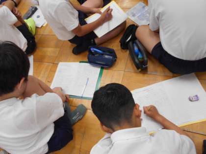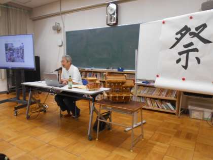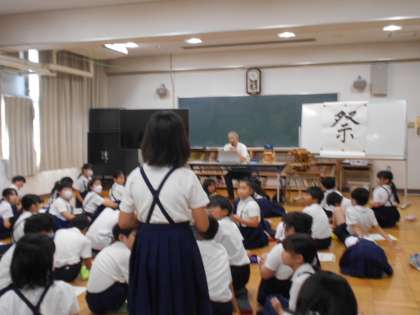 4年生は、若宮神社の宮司をさんをゲストティーチャーを招いての聞き取り学習をしました。「お祭りがなぜ行われているのか、いつから始まったのか」「だんぢりはいつ作られたのか」「だんぢりの大きさはどのくらいか」「聖賢地域にとって、お祭りはどのようなものなのか」など、聞き取ったことをワークシートにメモしていました。