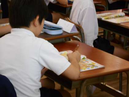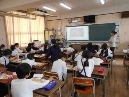 アルファベットの歌をリズムを各々が取りながら歌いました。その後、今日の学習である「アルァベットの小文字をさがそう」ということで、小文字を思い出しながら、教科書にある挿絵を見て探して発表していました。発音の仕方や日本語での言い方も一緒に学んでいました。