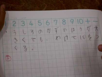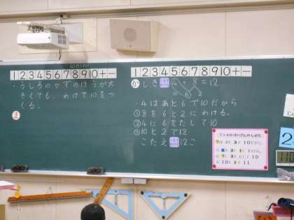 たしざんの学習でした。答えが10をこえる場合は、10の束を作って求めることを学びました。今日の学習は、大切な学習なので、学校での学習だけでなく、宿題でも取り組んで定着してほしいと思います。