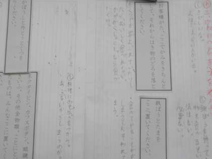宮沢賢治が書いた「注文の多い料理店」の学習です。扉ごとに書かれているメッセージを読んで、「なぜ、そのようなことを書いているのか」また、「そこに隠されている本当の意図は何だろうか」ということを考えました。一人ひとりが自分の考えをノートに記述した後、発言し合い、学級全員でその意図を確認していました。