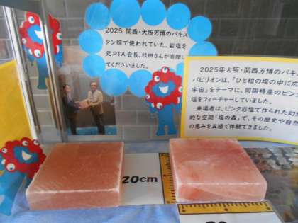 2025大阪・関西万博のパキスタン館の岩塩を正面玄関に飾っています。これは、元PTA会長のすぎ田さんが寄贈してくださいました。パビリオン内の床に使われていた岩塩で、癒しの効果があるそうです。岩塩についてやパキスタンについて、調べ学習につなげてくれたらいいなぁと思います。