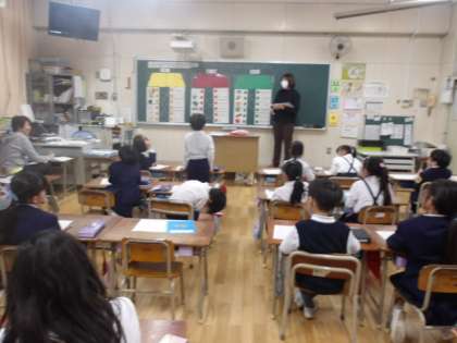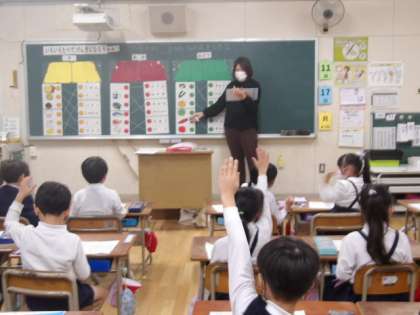 1年生が「いろいろたべて元気になろう」をテーマに栄養について教えていただきました。黄、赤、緑で分けた食べ物のはたらきについて、考えました。
