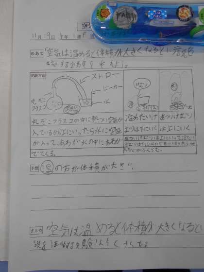 空気を温めると、どのような変化が起こるかを予想と、確かめる実験を各々のグループで考えを出し合いながら、レポートにまとめたことを発表していました。。