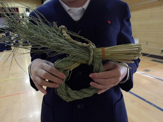 本日は毎年恒例となってきた、しめ縄プロジェクトの日です。まず1時間目は、4年生です。ペアで協力して、一生懸命作っていました。