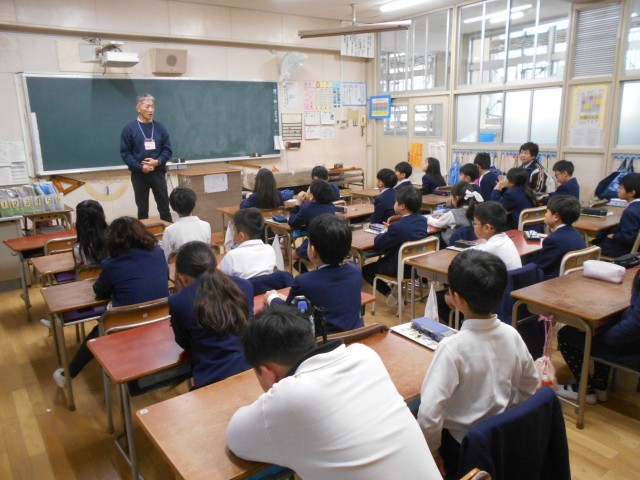 社会科の「けいさつしょ仕事」の学習でした。講師として、長い間、警察官の仕事をされて、今年度から勤務していただいている渡邉さんからお話を聞きました。普段私達には見えない仕事の内容も分かりやすく丁寧に教えていただきました。常に私達の生活の安全を守ることを大切にしながら、日々の仕事や体力の強化にも努めていることがわかりました。
