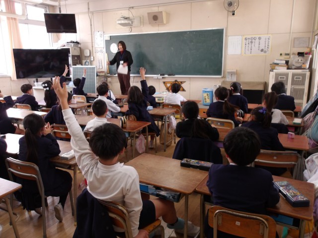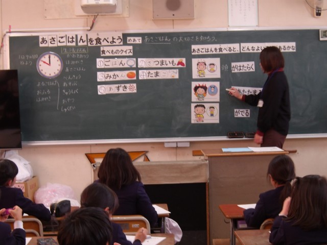 栄養指導の時間です。栄養教諭を招いて、朝ご飯を食べる大切さについて考えました。この時間に学習したことをいかすためにも、各家庭でのご協力をお願いします。