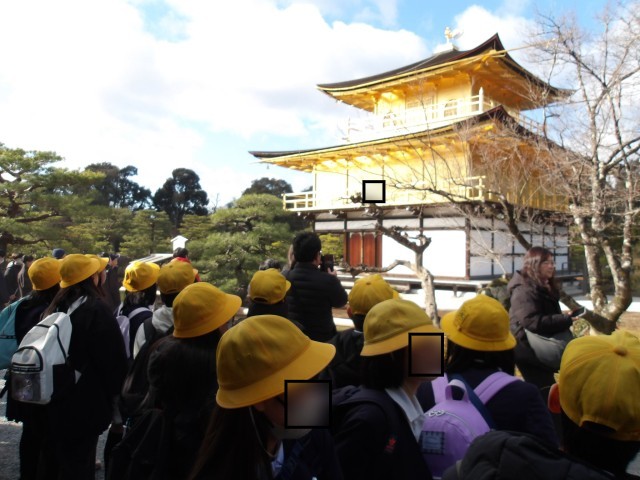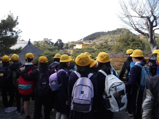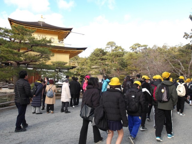 6年生が卒業遠足で、金閣寺と京都東映太秦映画村にいきます。金閣寺に到着しました。観光客も少なく、じっくりと見ることができました。