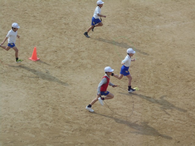 今日は、前日までの気温の低さが幾分和らいでいます。子どもたちは先生の指示を聞いて、各々が長く走れる速さを持続したままトラックのまわりを走っています。始めの頃よりは、走れる距離が長くなっています。その後、縄跳びを使って体を動かしていました。