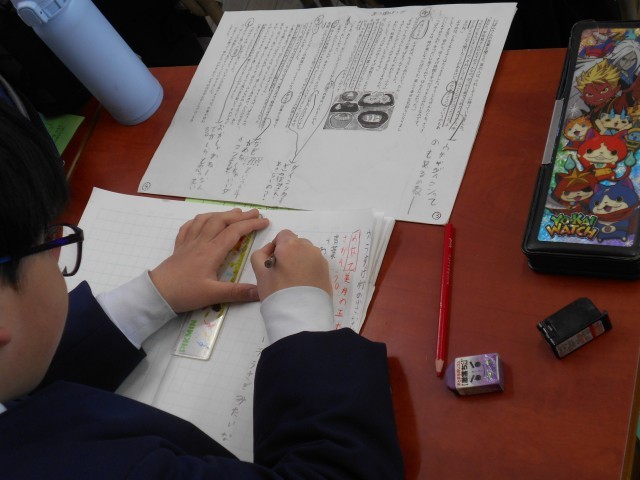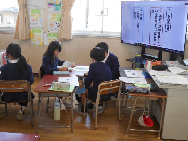 国語の時間でした。教材文に隠されている仕掛けを探しました。その仕掛けが登場人物とどのように関わっているか、その関係性について考えていきました。