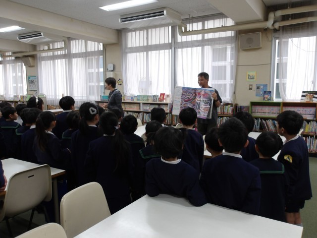 今日は、1年生がお兄さん、お姉さんになって保育園の園児に学校案内をしました。