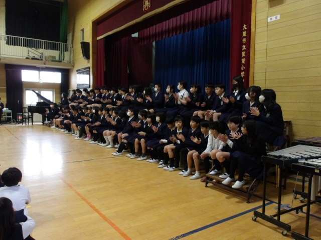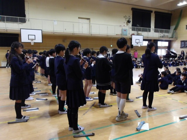 今日は、卒業までもう少しとなった6年生の卒業を祝う会でした。1年生から5年生までが合唱やリコーダーによる演奏、呼びかけをしたり、縦割り班で作った色紙を渡したりして今までの感謝の思いを伝えました。6年生からは、そのお返しに合奏と手作りの雑巾を各学級の代表者に渡しました。