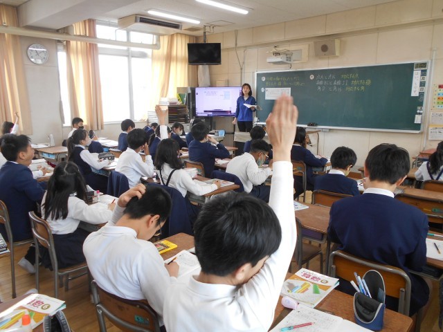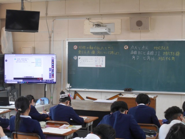 算数科の時間でした。大文字のアルァベットについて、線対象となる点はどこになるのか、辺はどこになるのかを調べて、担任が準備したカードに書き込んでいました。