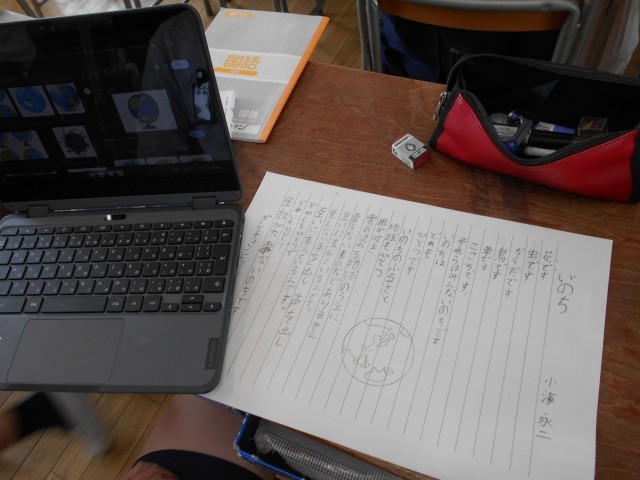 国語の時間です。「いのち」という題の詩を視写しました。視写をしながら、一人一人が思ったことを発表していました。
