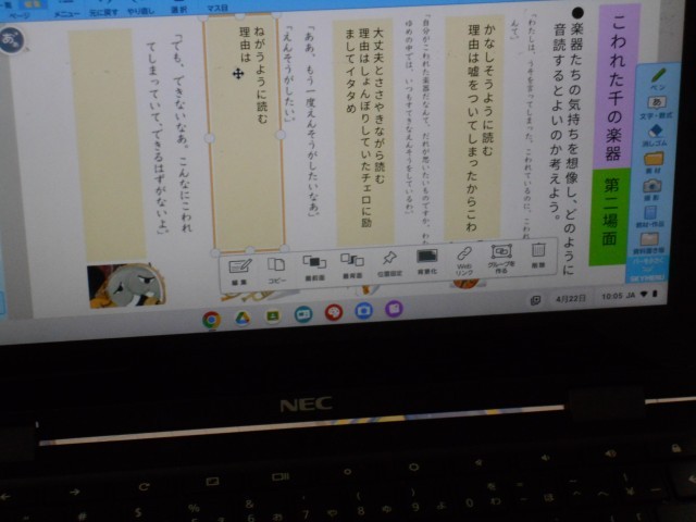 国語科の時間でした。「第二場面での楽器の気持ちを想像しながら、音読をしよう」というめあてでした。気持ちを想像できる言葉を手掛かりにして、各々児童が、よりよい音読をするため端末に工夫する点を書き込んだものを互いに見せ合って、参考にしていました。