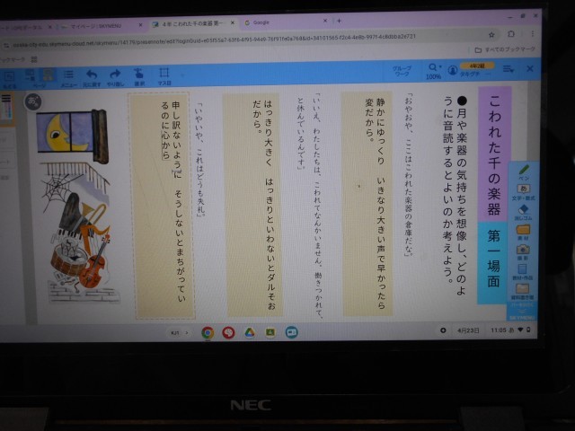 今日は、第一場面の学習でした。音読の仕方について、登場人物の気持ちや場面の様子を考えながら、端末に書き込んでいました。
