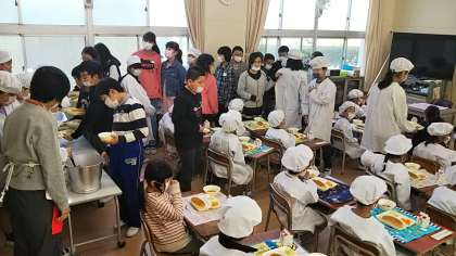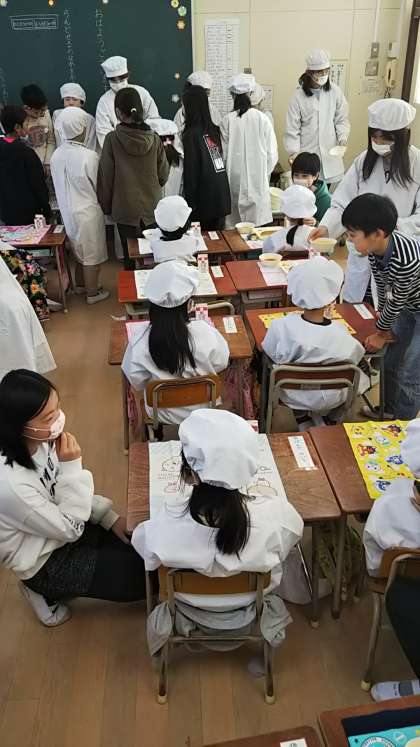 6年生が準備のお手伝いをして、食べ方を教えてくれました。1年生の皆さん、残さず食べようね。