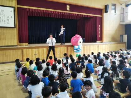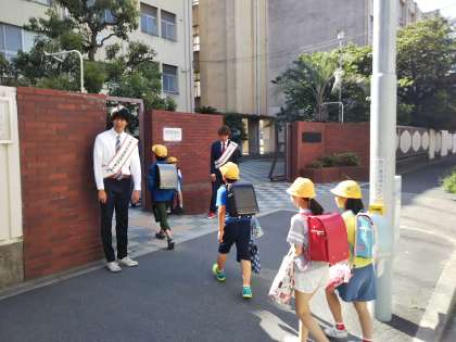 城東区役所の方々や城東区住みます芸人「アンプリ」にお越しいただきました。登校時のあいさつ運動に参加し、朝会での安全指導を行っていただきました。