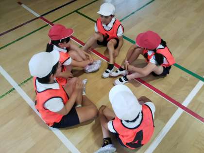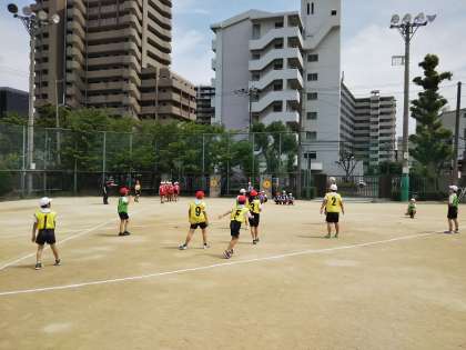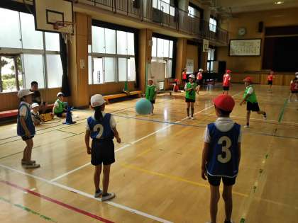 3・4年生の体育です。キックベースボールとプレルボールに取り組んでいます。