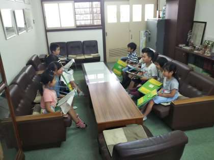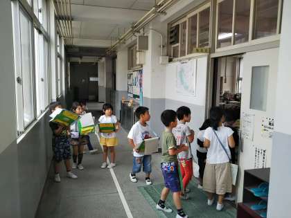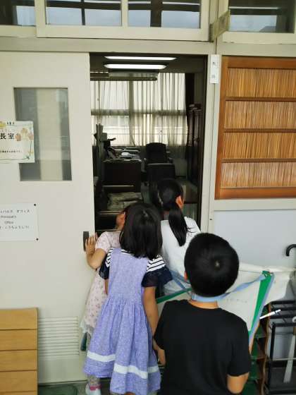 学校のいろいろな教室をグループでまわりました。メモをとりながら頑張っていました。