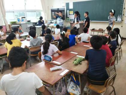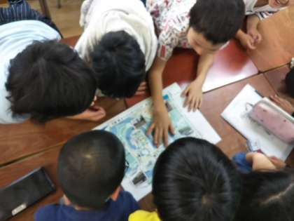 大阪城オリエンテーリングに向けて、地図を使い班長中心に説明をしています。終了後は、仲よく遊んでいました。