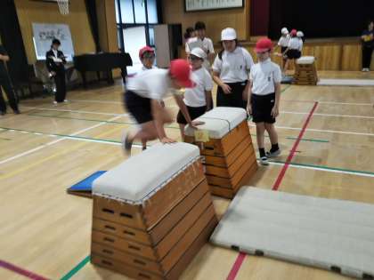 5年生の体育科において、とび箱の授業研究を行いました。友だちと声をかけあい、めあてに向かって取り組む姿を全教職員で参観しました。